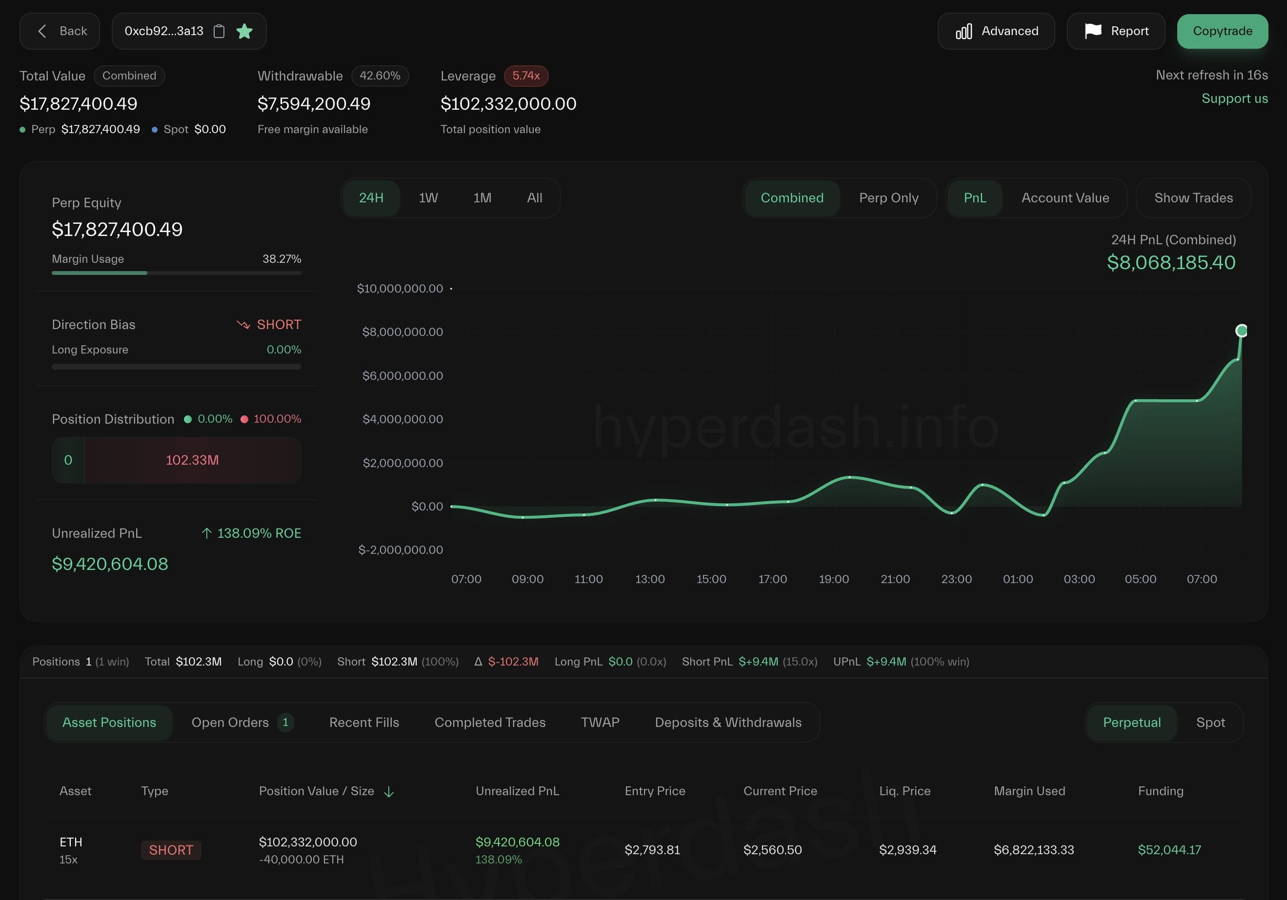 Profitto attuale (PnL non realizzato): +9,42 milioni di USD