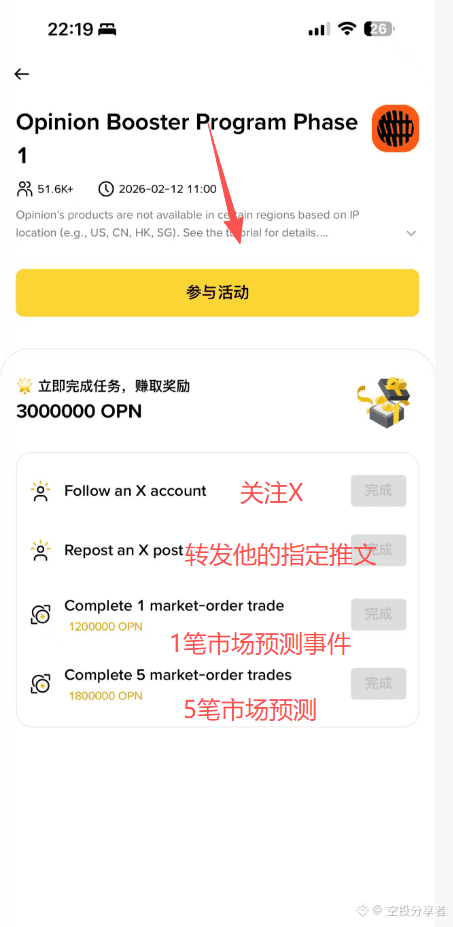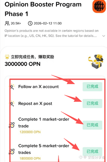 然后完成这些任务关注项目方 X 账户,转发指定推文,完成 1 笔市价预测事件交易(120 万$OPN 奖励),完成 5 笔市价预测事件交易(180 万$OPN 奖励)