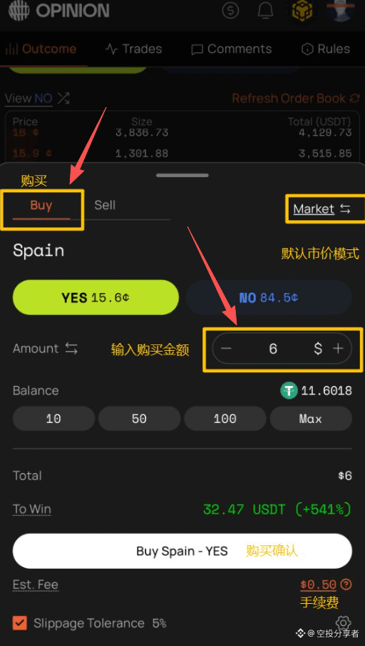 然后点这里,我翻译过来的看自己想买YES或者NO都行,就是做任务的默认的 Market 模式,Amount 数量输入 5 U 以上。买5次把20U花光!