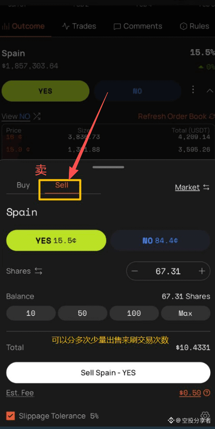 购买成功后,等一会,刷新页面重新进入你购买的事件,再次点击购买页面,然后切到 Sell 卖出就行!注意卖的时候分批卖,卖5次!完成任务