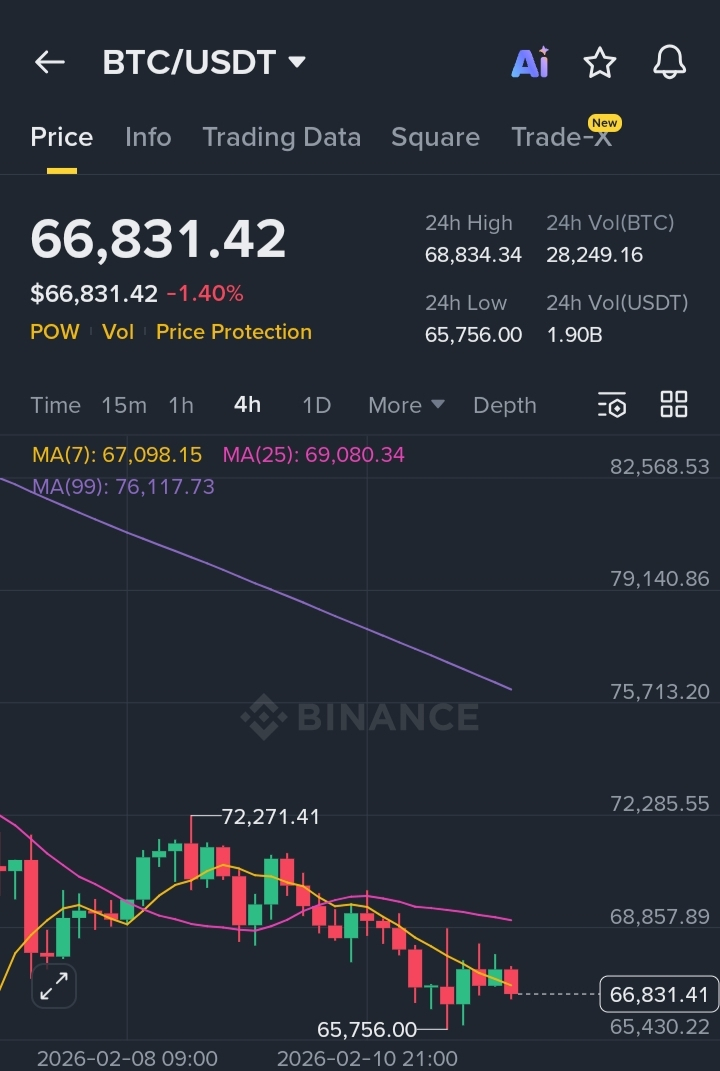 Bitcoin is currently trading near the $66,800 level following a rejection from the $72,200 resistance zone. The recent decline reflects a short term corrective movement within a broader consolidation structure rather than a confirmed trend reversal.