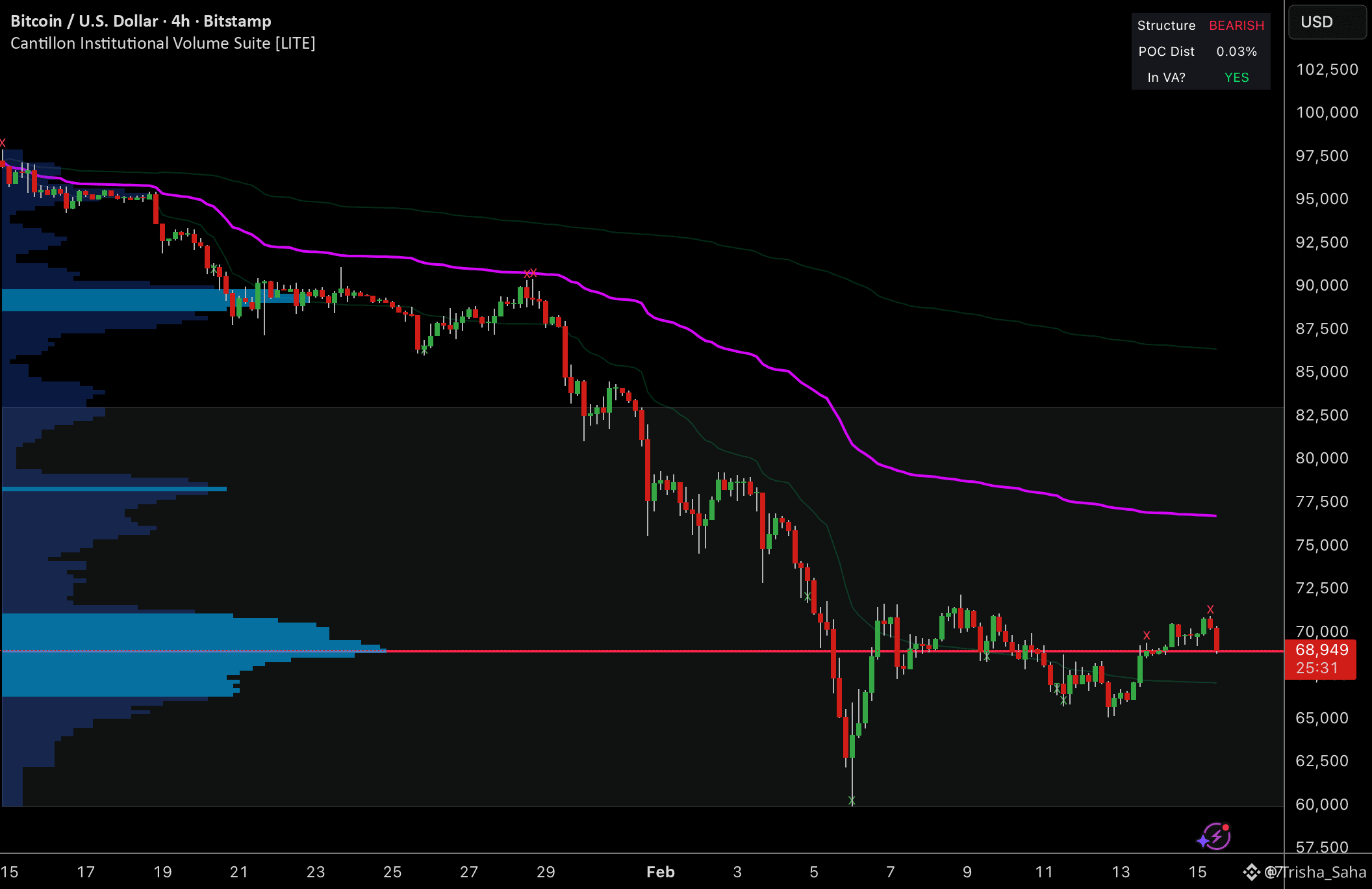 The SD bands (thin gray lines) show the statistical range. Price bouncing between the lower bands confirms the bearish trend is intact but not accelerating. Compression would be the next development to watch — if the range tightens here at POC, it sets up a directional resolution.