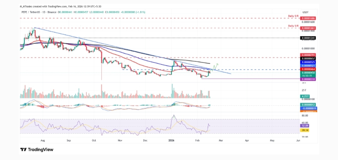 Da una prospettiva grafica, PEPE ha riconquistato la sua zona EMA a 50 giorni (~$0.0000046) — un'area di supporto dinamico comunemente osservata. Mantenere sopra questo livello segnala una struttura di trend in miglioramento.