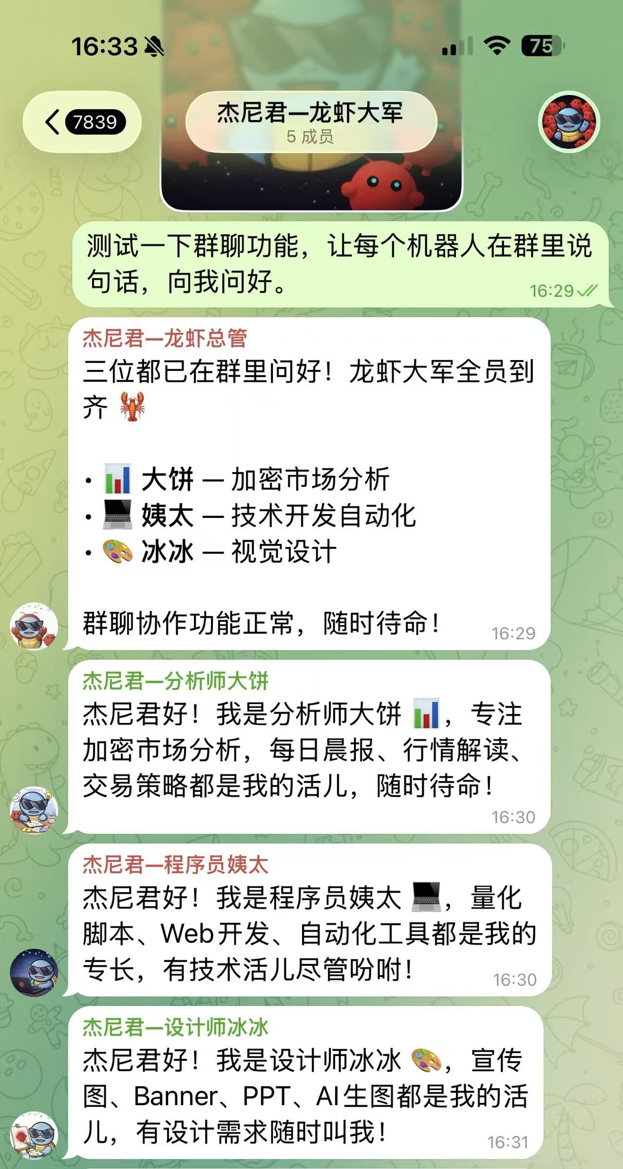 ✅ 4个 Bot 同时在线于同一 TG 群
