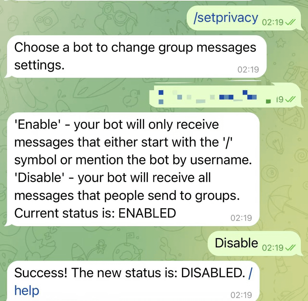 1. @BotFather 创建4个独立 Bot,拿到4个 token,再对每个子 Bot 执行 /setprivacy → 选 Disable,让 Bot 能读取群内所有消息(否则只能读到 @ 自己的消息)