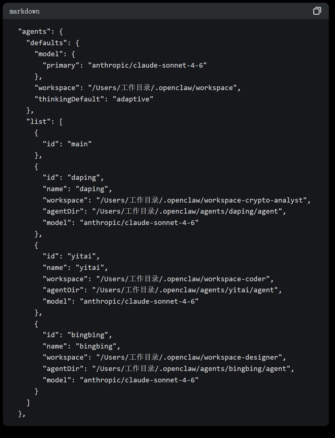 3. openclaw.json 里配置子 Agent,以下代码为杰尼君代码,可以直接喂给你的主机器人,让他学习代码自己配置即可,机器人名称/ID/工作目录自己修改: