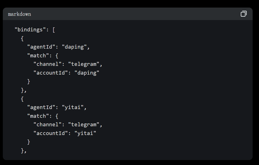 4. bindings 数组绑定 Agent ↔️ Bot: