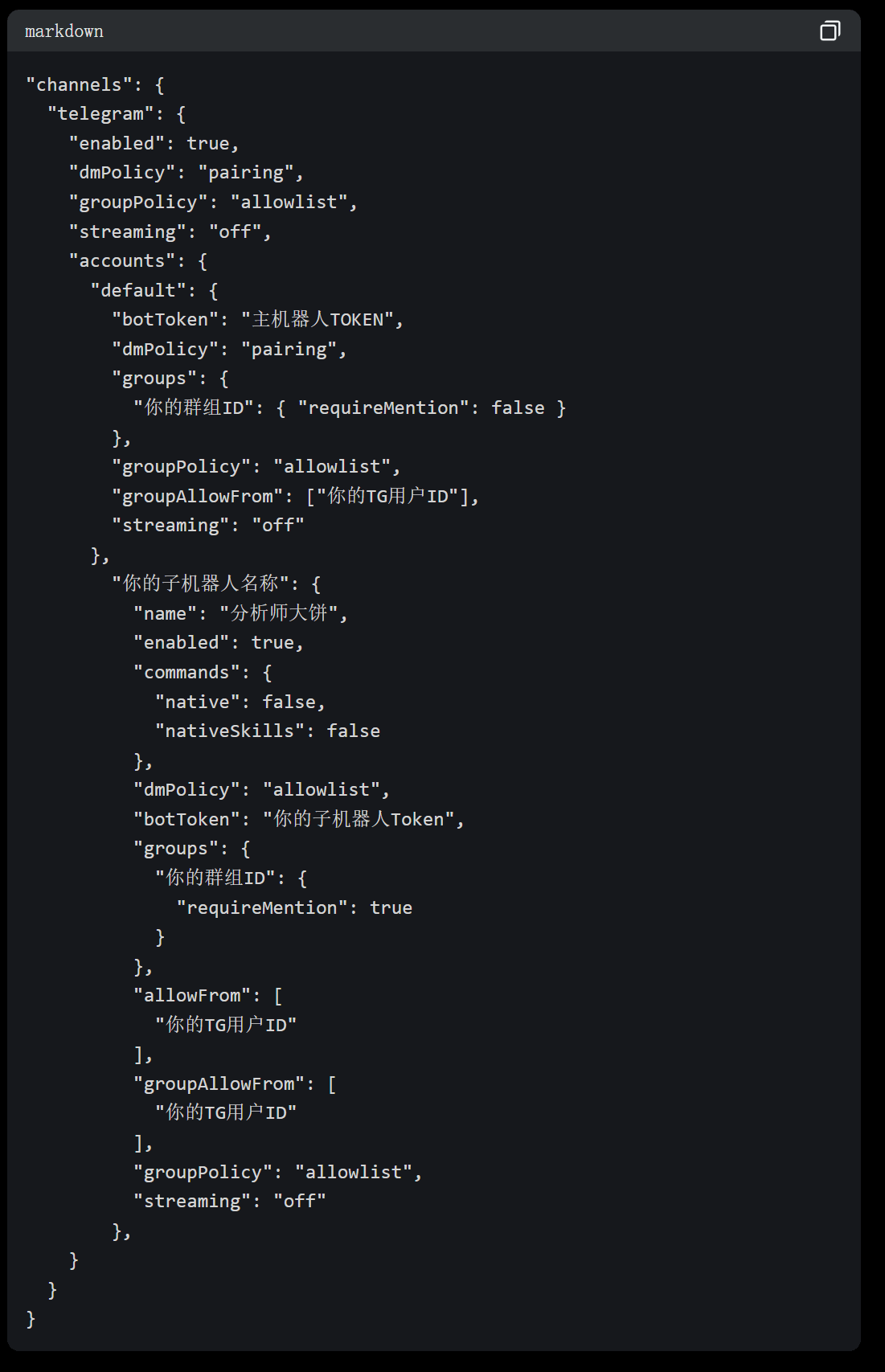 2. openclaw.json 里配置4个 account(channels 部分),以下代码为杰尼君代码,可以直接喂给你的主机器人,让他学习代码自己配置即可: