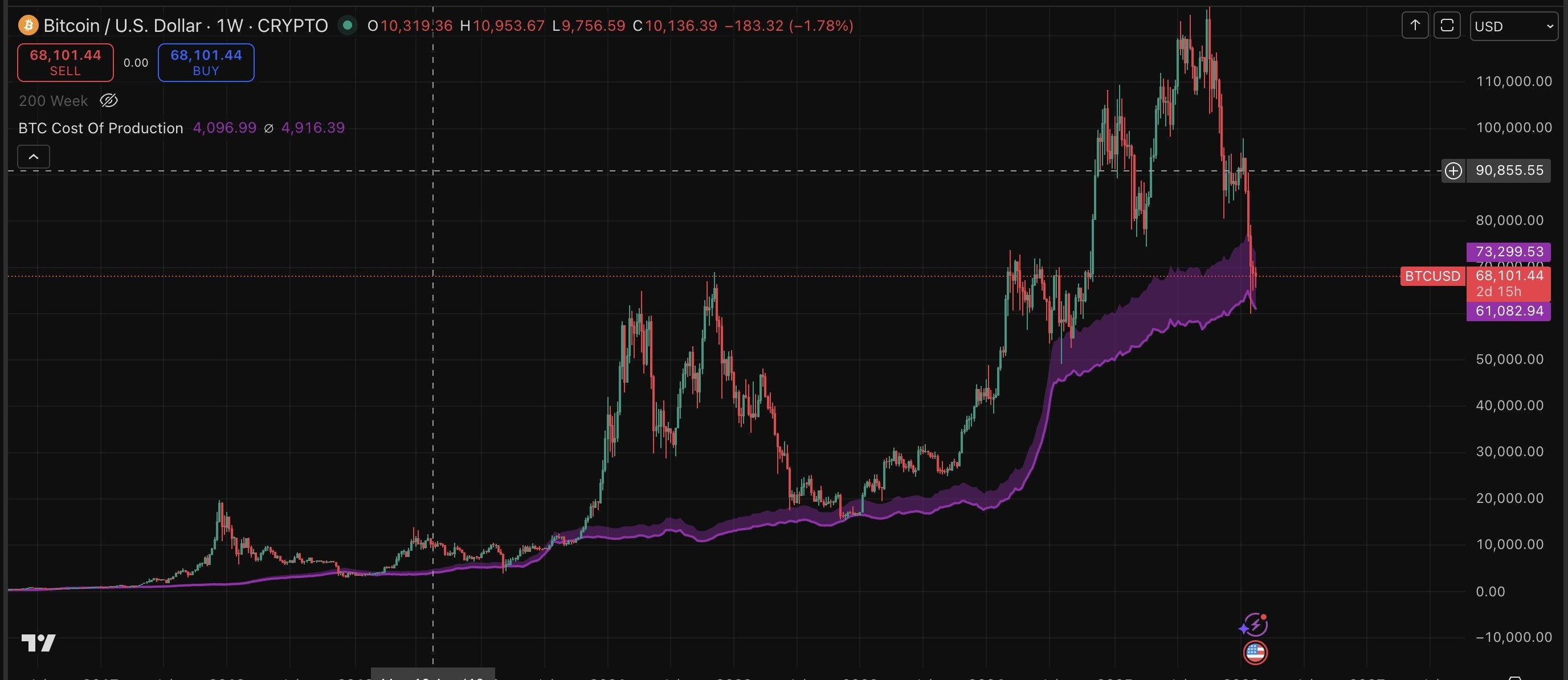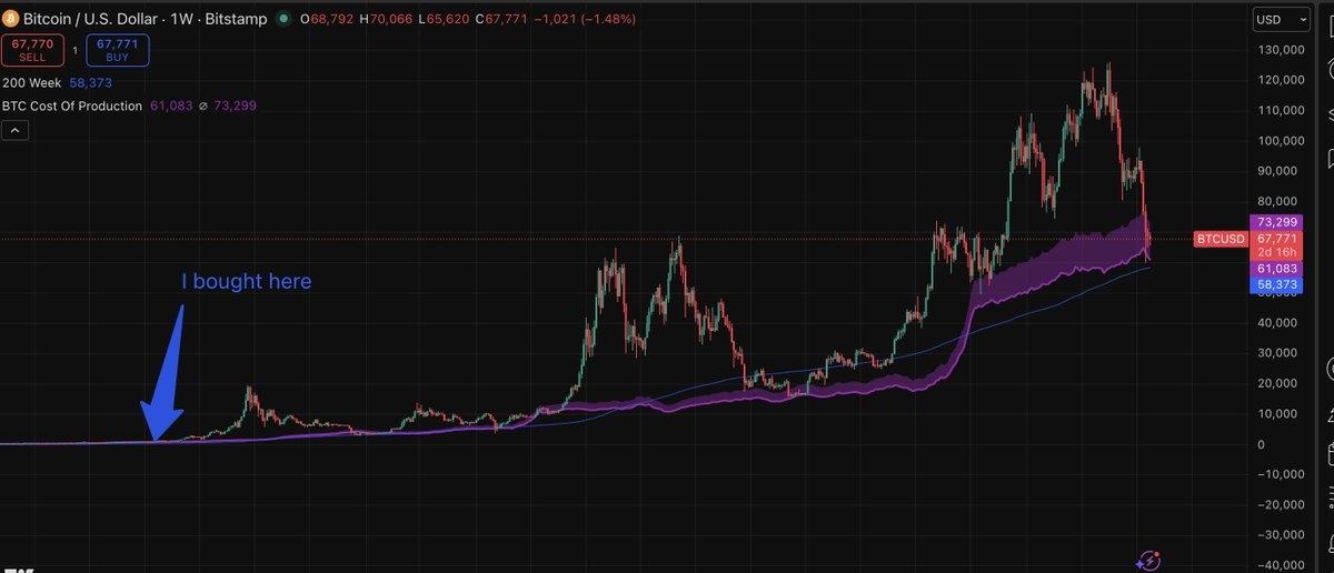 Quanto costa attualmente ai miner creare un nuovo Bitcoin — principalmente elettricità + usura delle macchine. Attualmente, a febbraio 2026, si aggira intorno ai $77,000–$79,000, quindi se il prezzo di BTC rimane molto al di sotto di questo per troppo tempo, i miner vendono tutti i loro BTC per mantenere accese le luci; una volta esauriti i BTC, di solito tocchiamo il fondo. I miner hanno attualmente circa il 20% di tutti i BTC.
