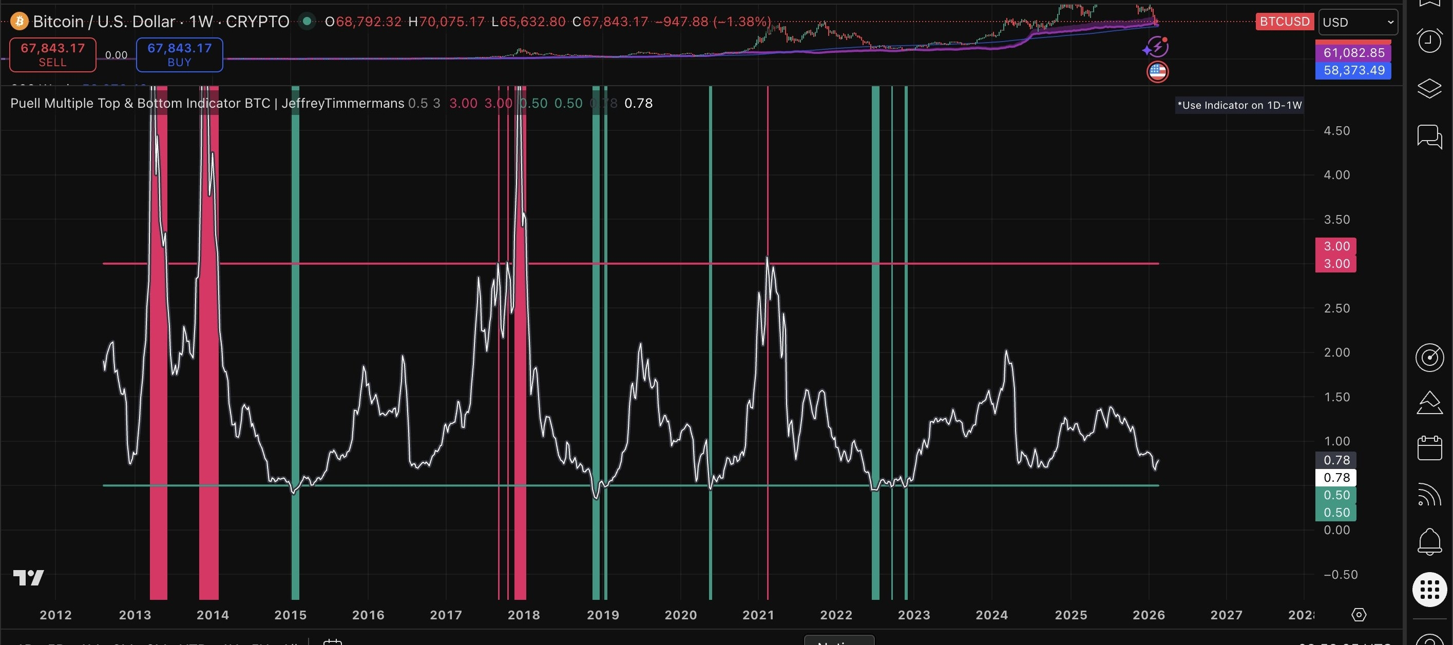 Il Puell Multiple è una metrica di valutazione di Bitcoin che analizza le entrate dei miner. Se il punteggio è sotto 0.5, tutti i miner stanno estraendo in perdita. Ogni volta che l'indicatore era sotto 0.5, abbiamo toccato il fondo e il prezzo è aumentato poco dopo. Ha raggiunto 0.66 finora.