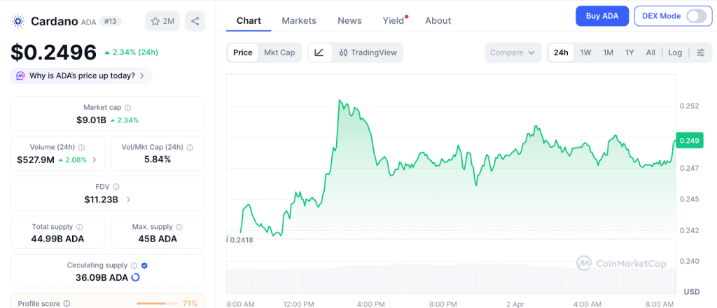 La previsione del prezzo di cardano che punta a $0.35 a $0.57 quest'anno riflette un progetto che finalmente sta realizzando le proprie promesse. ADA a $0.249 che raggiunge quegli obiettivi è un ritorno significativo per il capitale paziente secondo CoinMarketCap.