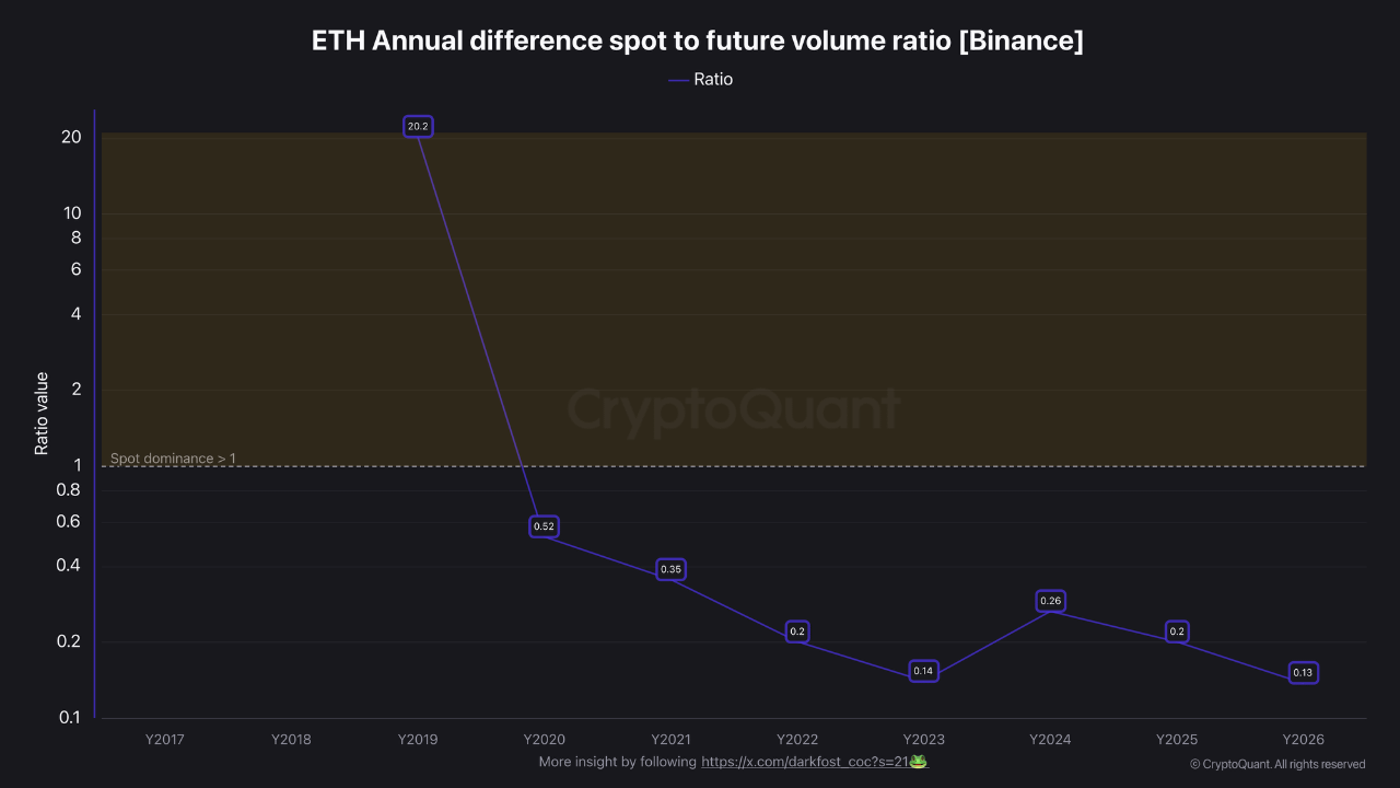 Il rapporto volume spot-futures su Binance è ora sceso a 0.13, il livello annuale più basso mai registrato per ETH.