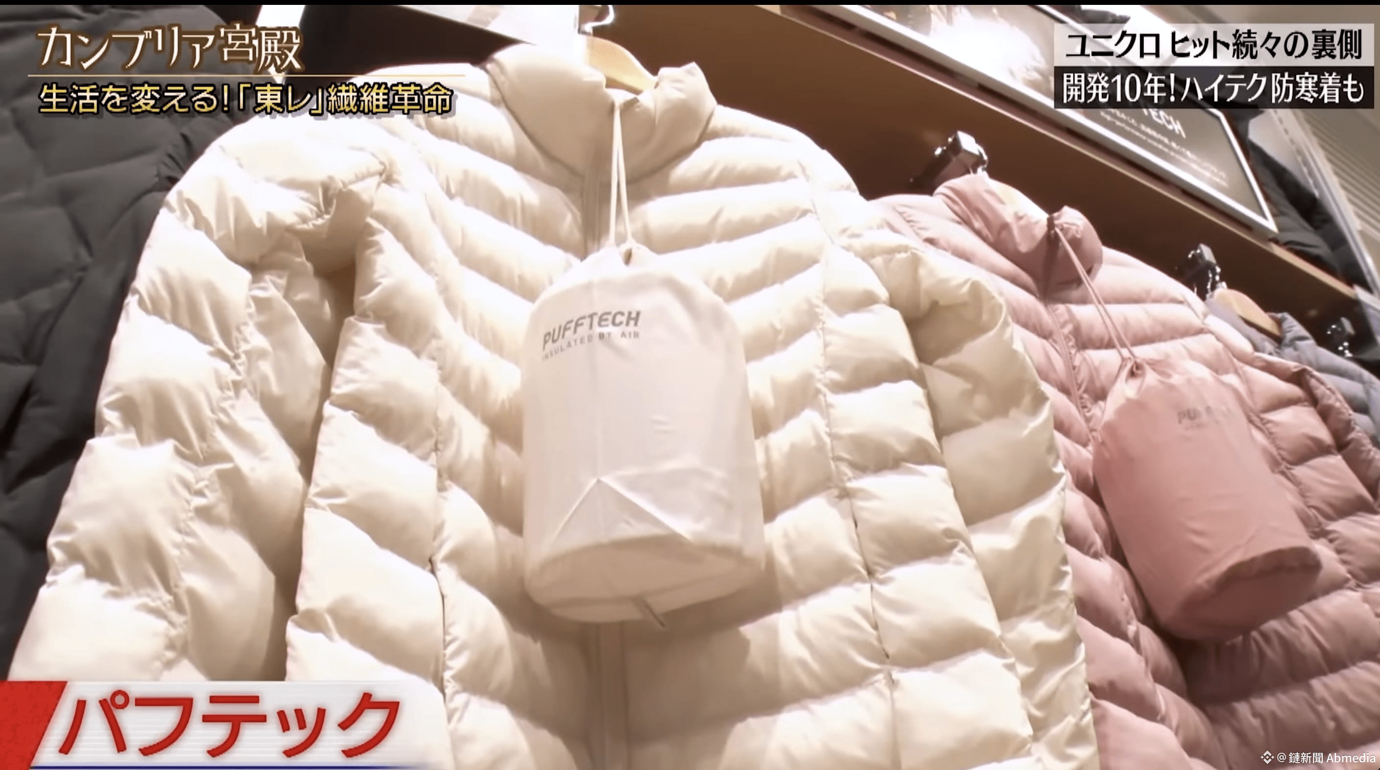 歷經十餘年研發,Uniqlo 推出全新無鵝毛羽絨衣,這種人造合成的面材兼具輕盈與耐用性,成為替代羽絨的新型面料,暢銷人造纖維羽絨衣背後的技術來自於東麗。東麗的創新可追溯至其早年從植物纖維素生產「利歐纖維」的時代,後來進一步拓展至尼龍與各類合成纖維。走入工廠,堆滿原料碎片的容器會先被加熱至接近三百度,在高壓下熔融,再從極細的噴嘴擠出成絲。這些噴嘴的孔形與排列,將決定纖維最終的形狀與特性。東麗最具代表性的技術,正是能以奈米級精度設計纖維橫截面。研究人員展示的顯微影像中,僅針尖大小的一根纖維,就由不同樹脂組成的黑白區塊構成,讓纖維能同時具備吸濕、反射、蓄熱或耐候等需求。這些技術讓新布料得以誕生,也成為優衣庫產品高性能的核心來源。