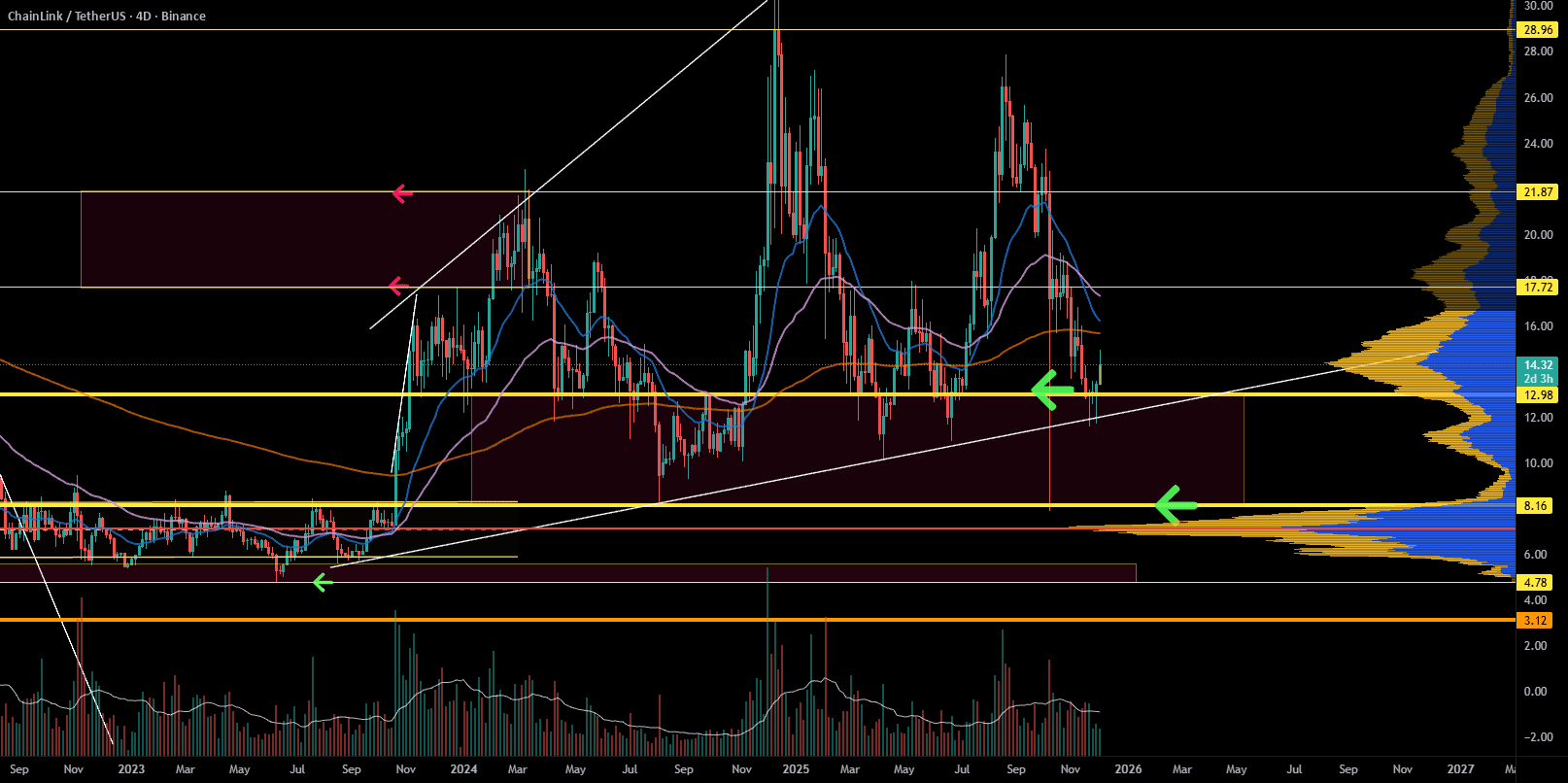 Chainlink sta testando nuovamente una linea di tendenza principale a lungo termine che ha agito come supporto per quasi due anni. Il prezzo è tornato in un nodo ad alto volume, suggerendo che questa regione è dove il mercato storicamente concorda sul valore.
