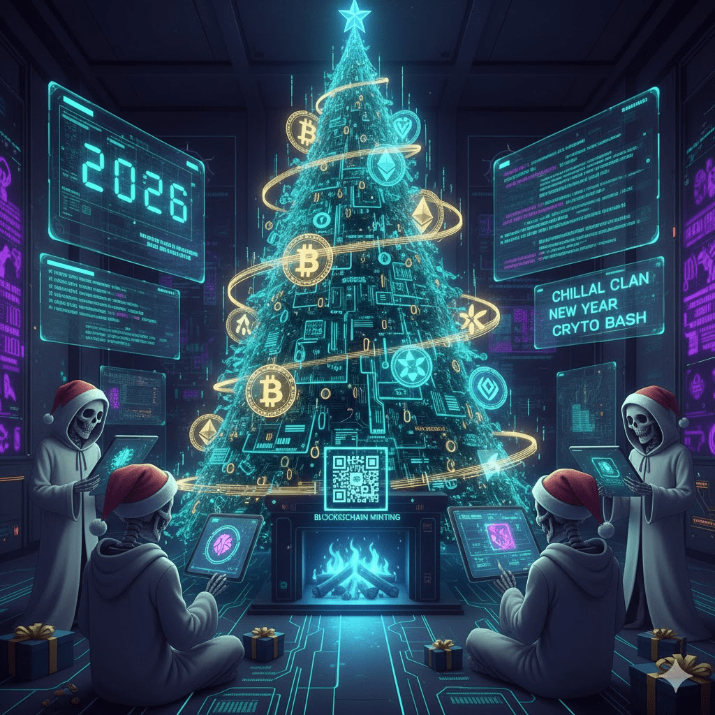Il panorama digitale sta cambiando mentre ci avviciniamo all'alba del 2026, e il "Chillal Clan" è in prima linea in questa evoluzione festiva. Quest'opera d'arte cattura una celebrazione puramente crypto-nativa dove la tradizione incontra il registro immutabile. In questa scena, figure scheletriche—che simboleggiano l'etica del "HODL fino alla morte"—sono viste riunite attorno a un albero di Natale decorato non con festoni, ma con simboli olografici luminosi di Bitcoin, Ethereum e altri asset principali. L'ambientazione è una fusione di alta tecnologia e calore festivo, con un forno di "Mining Blockchain" che elabora le transazioni invece di bruciare tronchi, illuminando la stanza con il bagliore blu di un gateway QR.