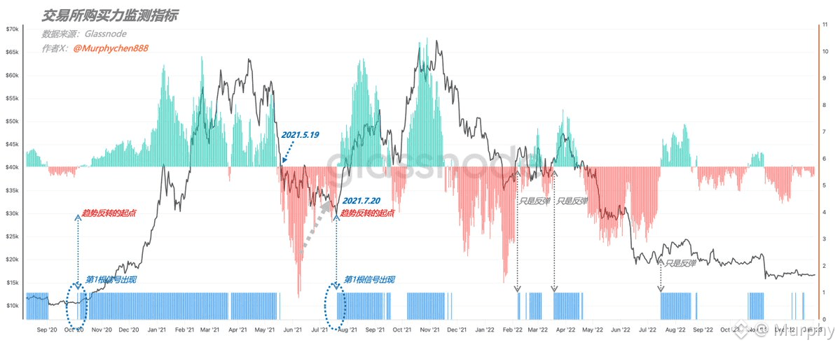 再举个例子:21年519黑天鹅事件发生时,BTC已经从6.3w高点跌至3.7w;但此时我们看到“交易所购买力”信号显示的是“从有到无”,此后继续下跌,直到7月20日出现了第1根蓝色信号开始反转。