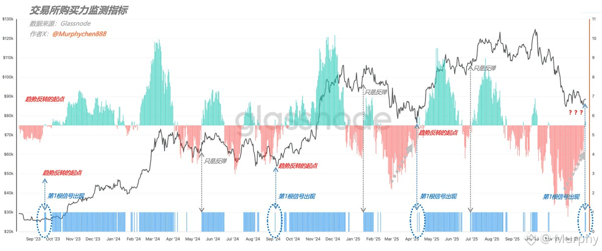 此后该信号也多次出现过“从无到有”的情况,但由于后期交易所购买力增长幅度有限(绿色波形不够高),最终全部都只是反弹。