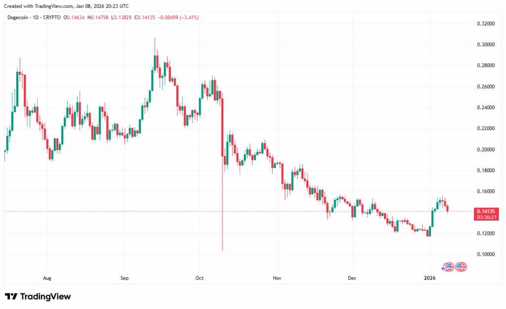 DOGE è attualmente quotato a $0,1473 e ha perso circa il 7% dal 8 gennaio. Dogecoin fatica a creare il proprio movimento di prezzo poiché dipende sempre da Bitcoin, e con il mercato generale in calo al momento, il suo prezzo avrà difficoltà a mantenere la tendenza rialzista.