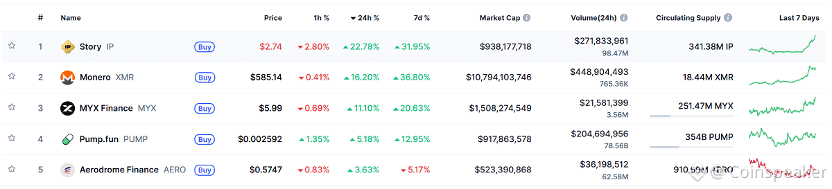 IP claims the top slot as highest gaining cryptocurrency by 24-hour price increase. Source: CoinMarketCap