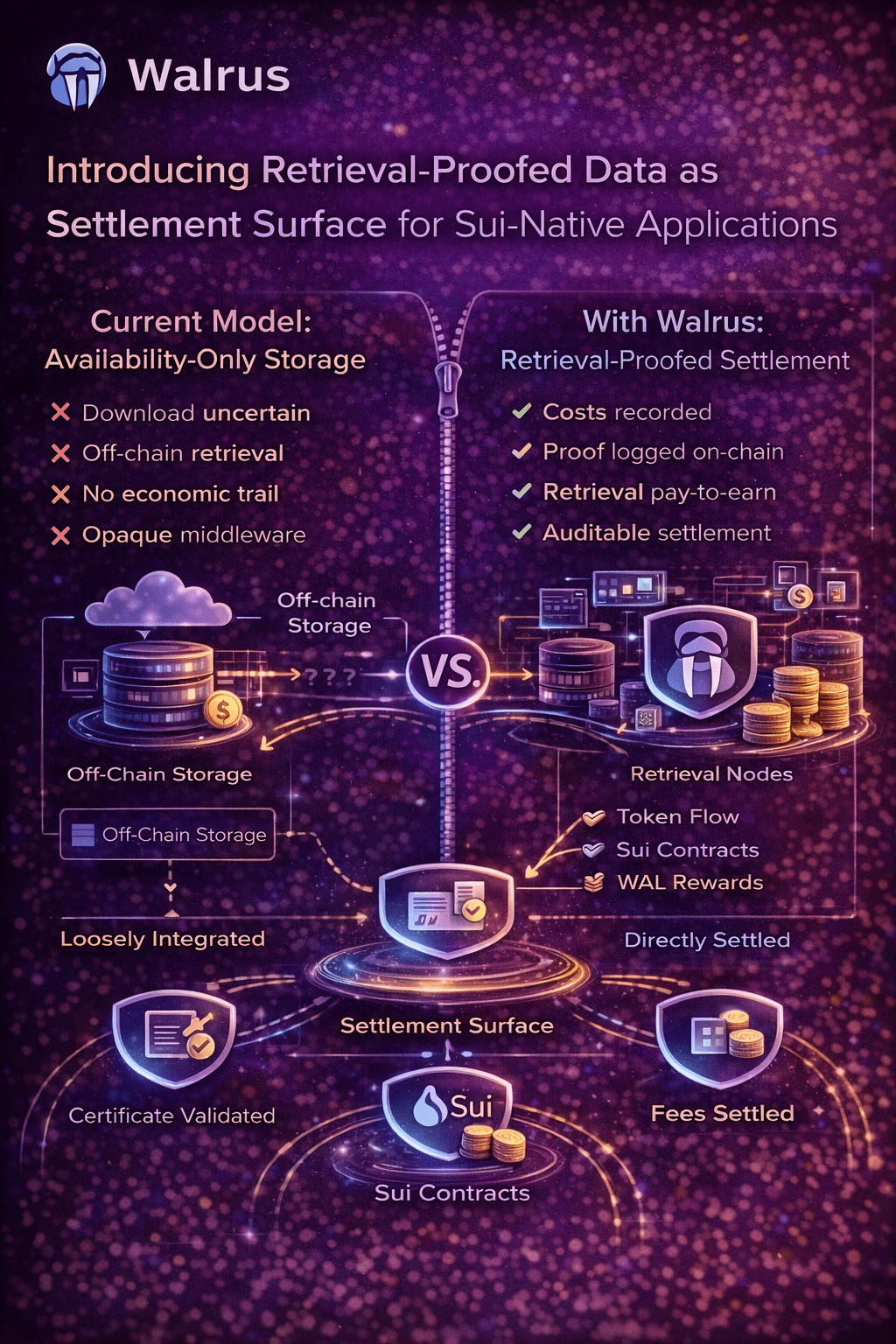 Walrus sposta lo stoccaggio da un'assunzione di fiducia a una risorsa programmabile e sposta il recupero da un effetto collaterale a un evento di regolamento.