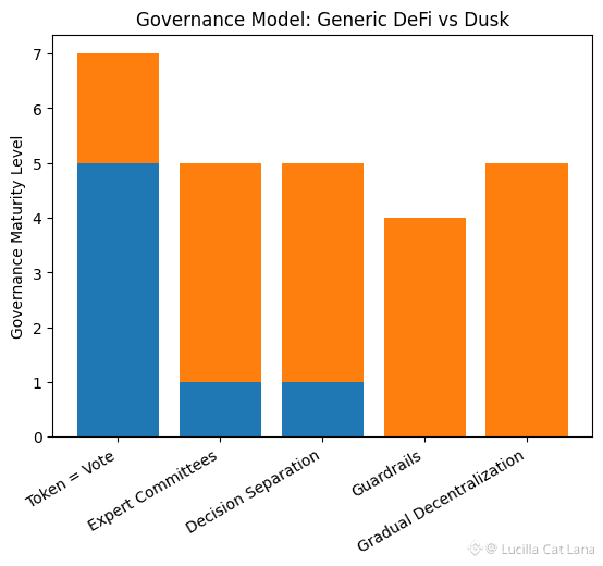 Ще один важливий момент: #Dusk не робить governance обов'язковим з першого дня. Є початкова фаза, коли команда має більше контролю, щоб швидко адаптувати протокол до реальних потреб. Це чесно. Замість того, щоб удавати повну децентралізацію з дня запуску (як роблять багато проєктів, а потім виявляється, що команда контролює 70% токенів), Dusk відкрито каже: зараз ми в режимі швидкого розвитку, governance буде поступово децентралізуватися, коли протокол дозріє. Для інституційних учасників це насправді плюс. Вони не хочуть, щоб критичні рішення про безпеку приймалися анонімними токенхолдерами через Twitter голосування.
