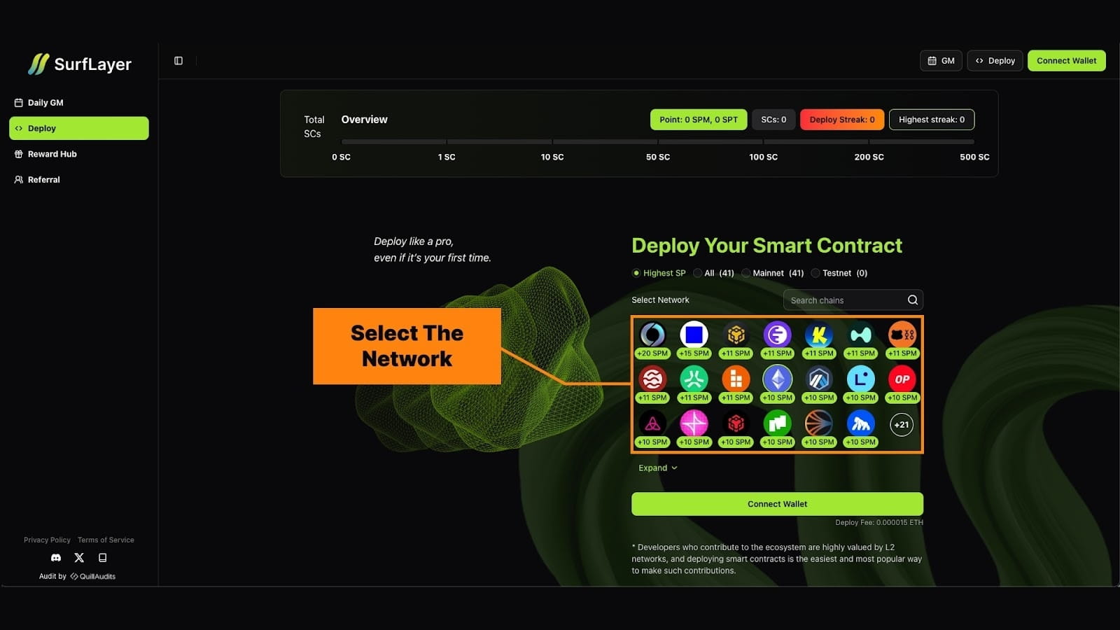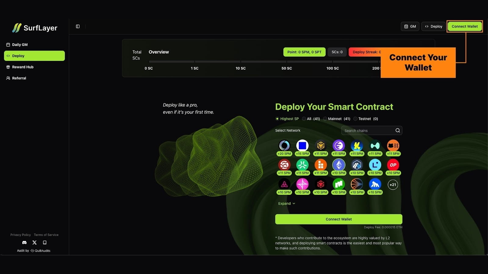 Vai su SurfLayer https://surflayer.xyz/deploy e collega il tuo portafoglio per accedere alla funzione di distribuzione.