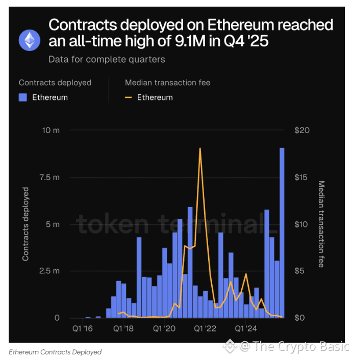 Meanwhile, further data from Token Terminal show that Ethereum reached an all-time high of 9.1 million contracts deployed in Q4 2025. This surge in contract deployments proves Ethereum’s increasing network activity and adoption.