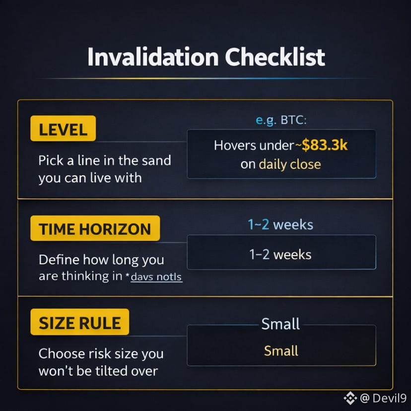 Most people “use a stop” but don’t define what being wrong actually means. My personal approach is boring: I pick one invalidation condition I can live with, then size down so the stop is survivable. For example, if I’m thinking in “1–2 weeks” terms, I don’t want my thesis to depend on every 15-minute candle; I want it to depend on a daily close relative to a level I chose before the trade. That’s how you avoid revenge trading when the market turns into a pinball machine.
