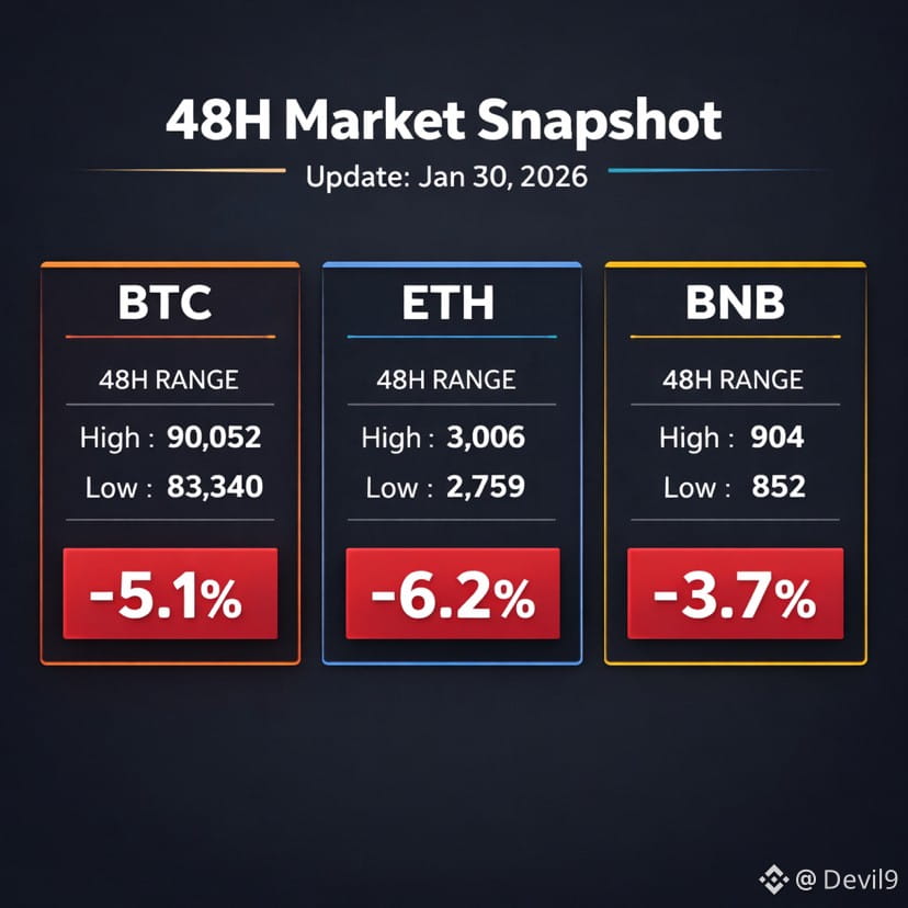 Over the last 48 hours (Jan 29–30, 2026), the clean “one-direction” vibe cracked: BTC is down about ~5% on the day, ETH ~6%, and BNB roughly ~4% with wide intraday ranges.