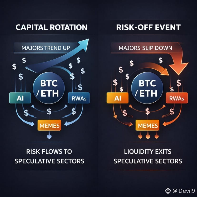 What most people are missing: rotation only matters if BTC/ETH are stable enough for risk to stay funded; when they’re not, the “hot sector” is just the last place liquidity exits from.
