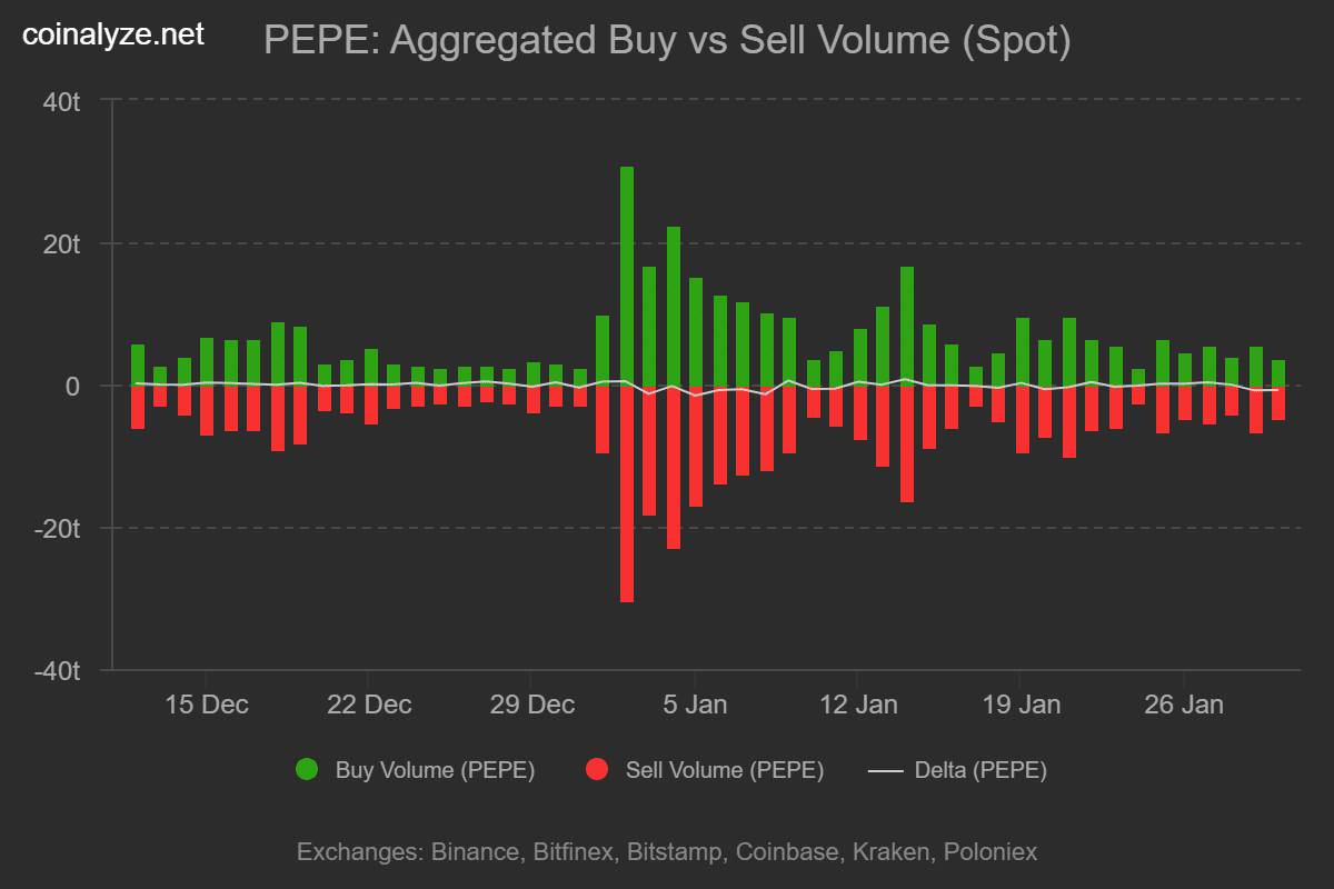 Stochastic RSI è sceso a 13.5 con un incrocio ribassista. PEPE sta negoziando sotto tutte le principali linee EMA (20, 50, 100, 200).