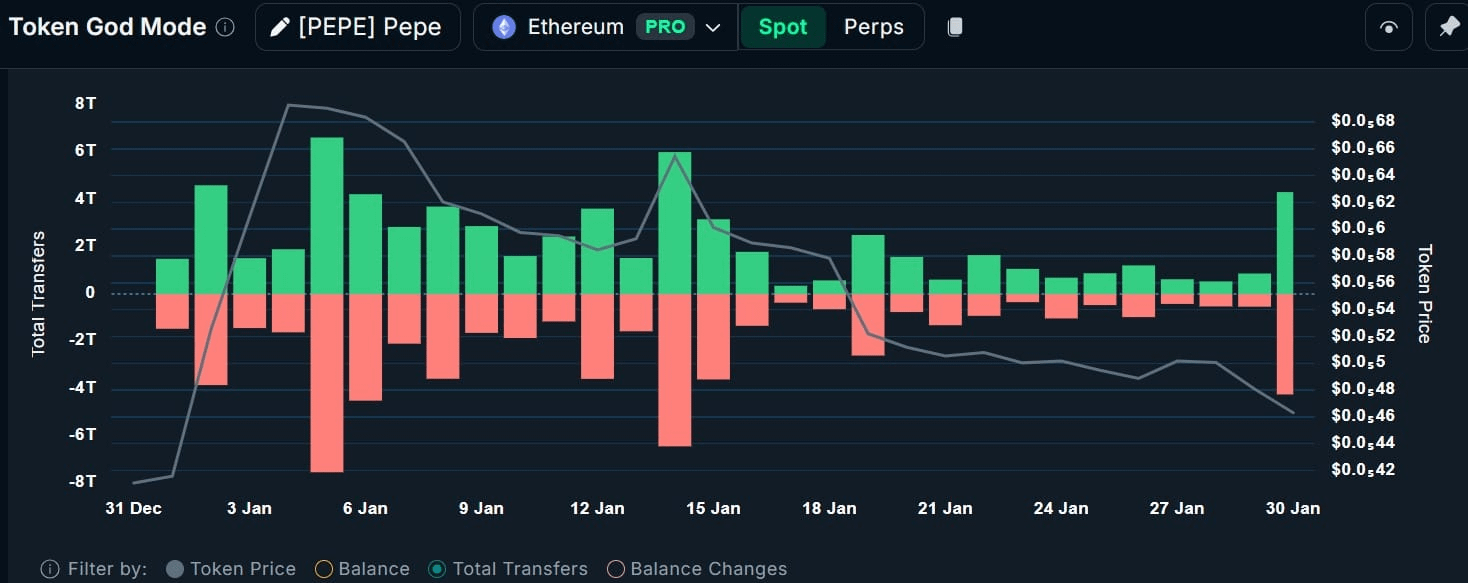 Una balena ha appena svenduto quasi 4 milioni di dollari di PEPE dopo mesi di detenzione. Ti tufferai per cercare di comprare il fondo in una zona di ipervenduto, o aspetterai il livello di supporto a $0.0000043?