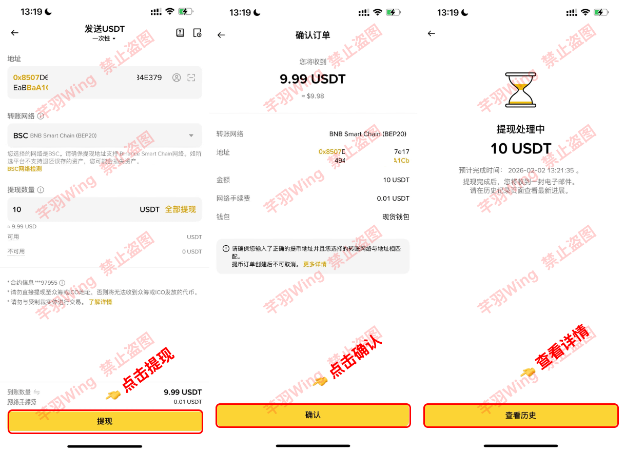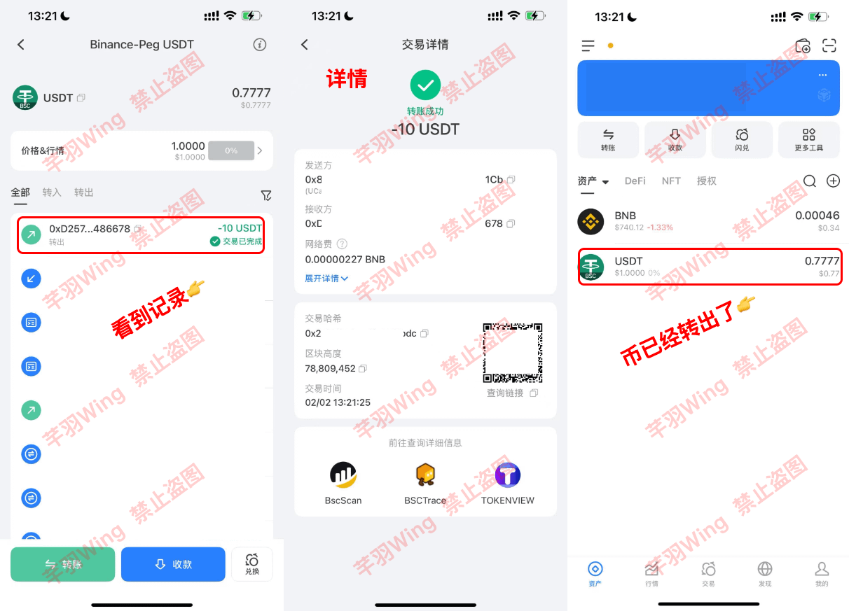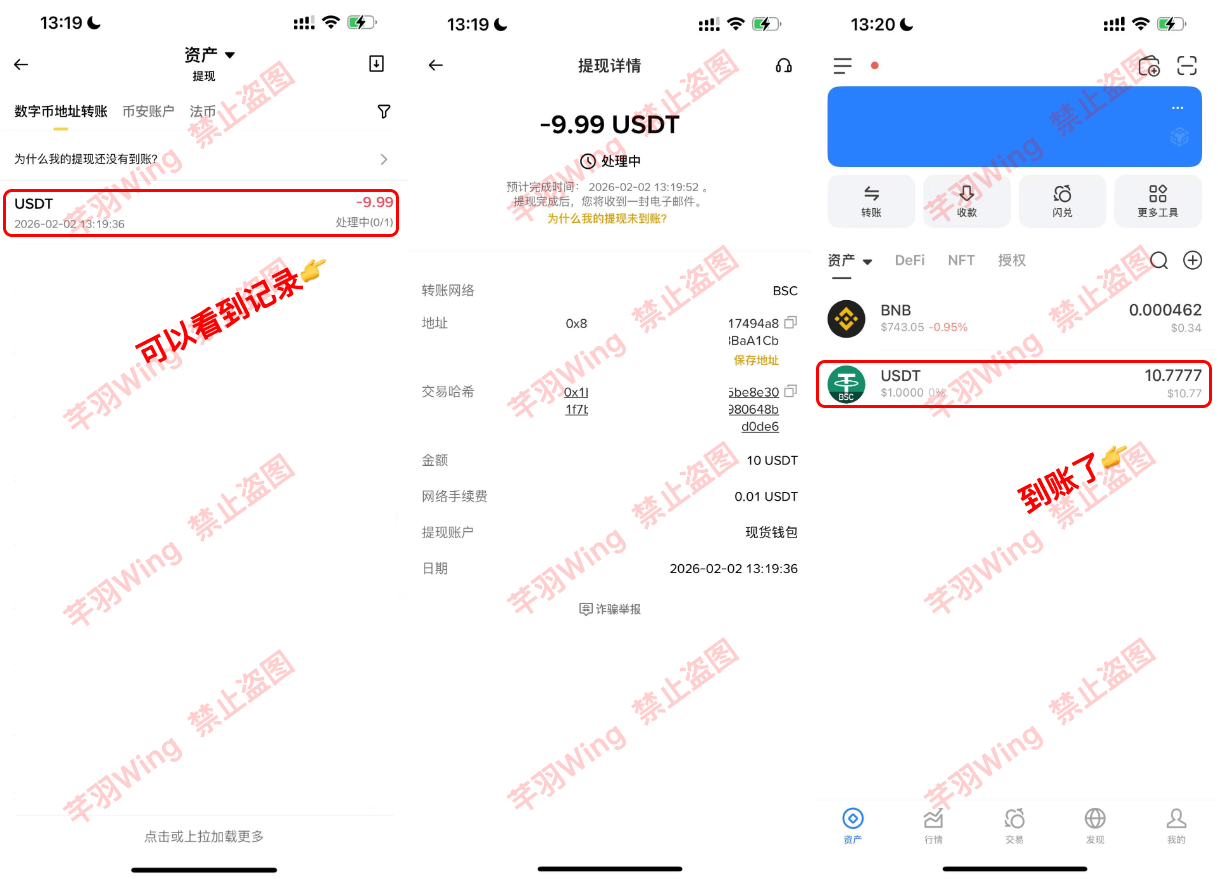 5、visualizza i dettagli del prelievo, torna al portafoglio per vedere se il denaro è arrivato, la rete BSC è molto veloce!
