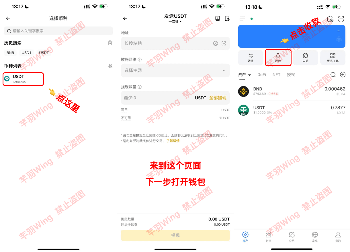 2. Seleziona USDT, fai clic su ricevi nel portafoglio