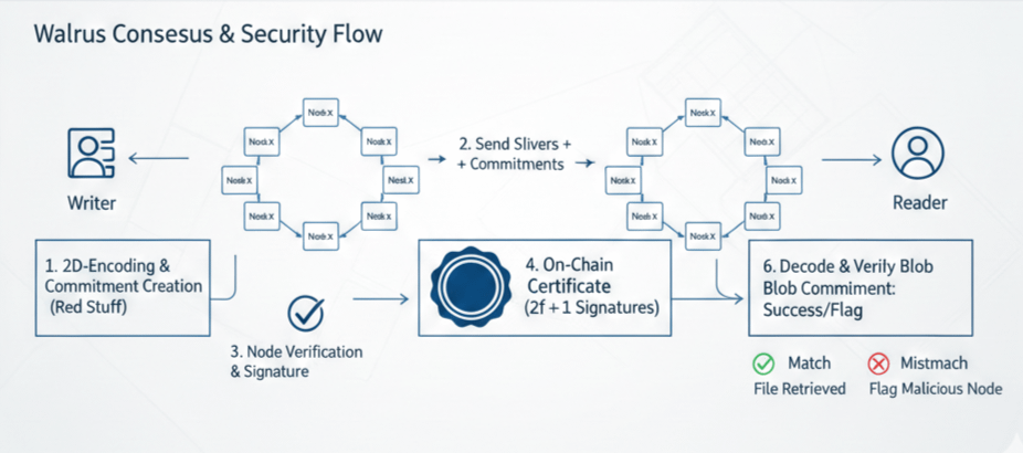 Se un nodo prova a servire dati "falsi", gli impegni (quelle impronte digitali che abbiamo menzionato) lo segnaleranno immediatamente. Il resto della rete Walrus vedrà la discrepanza. In questo modo, Walrus crea un ambiente auto-riparante e auto-controllante.