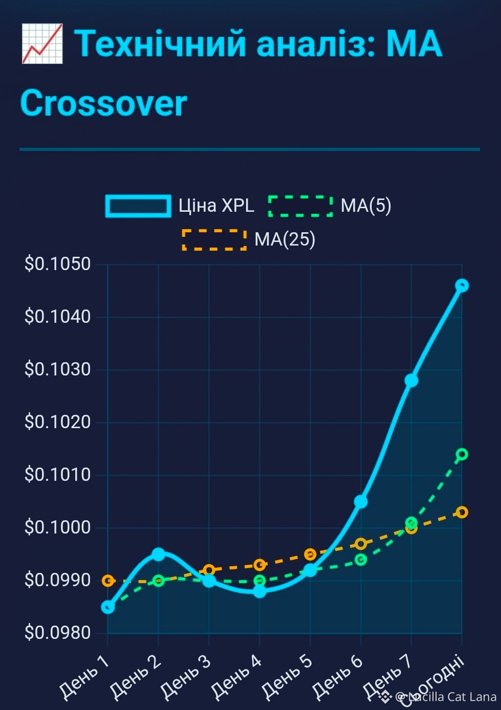 Дивлюся на графік — MA(5) перетнула MA(25) знизу вгору. Технічний аналіз каже "бичачий сигнал". Але технічний аналіз не пояснює, чому це сталося. А я думаю — може, хтось нарешті зрозумів, що спеціалізація має сенс? Що не потрібно будувати "блокчейн для всього", достатньо зробити блокчейн для чогось одного, але дуже добре.