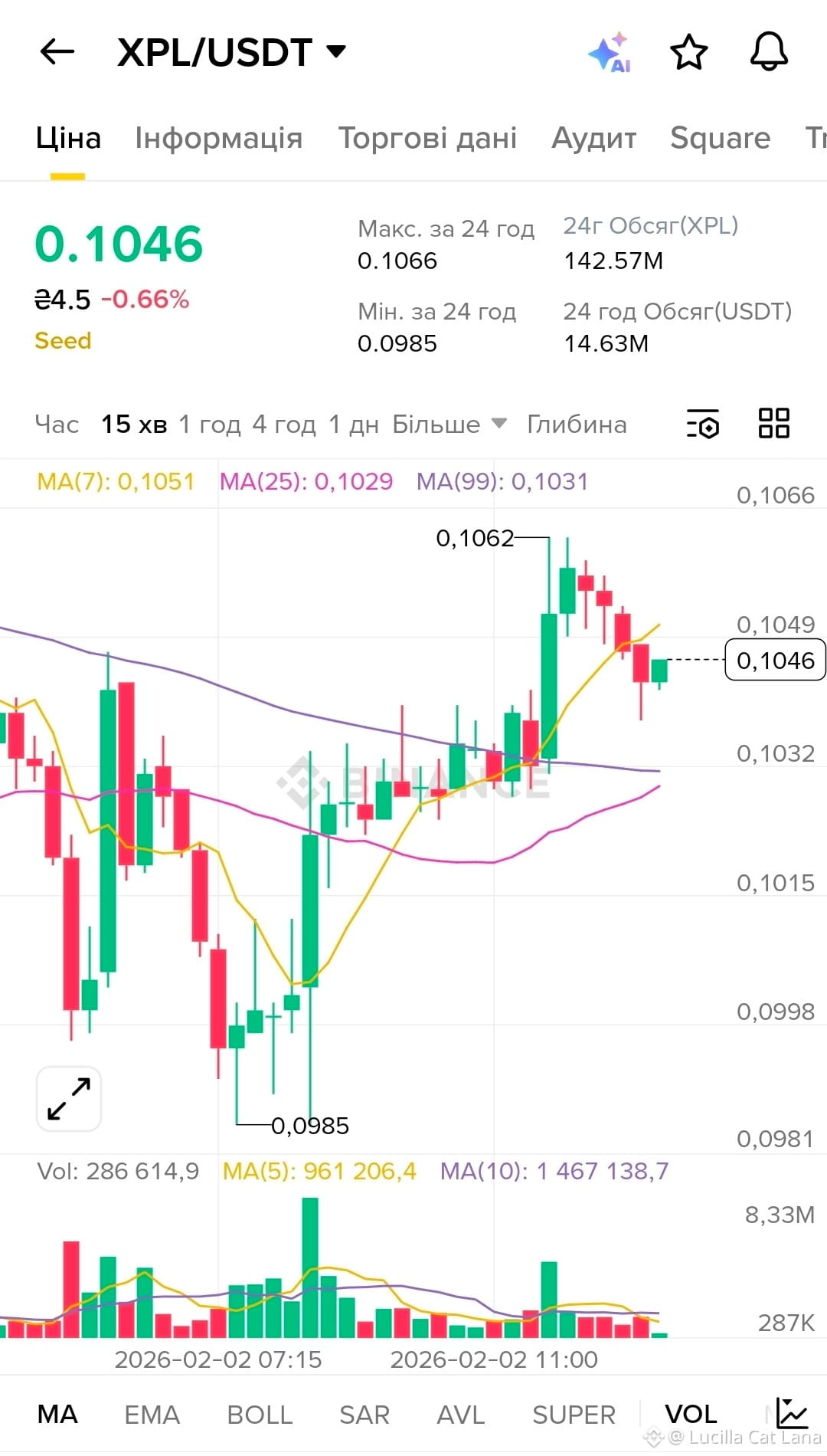 Сиджу, дивлюся на графік $XPL — ціна 0.1046, відскок від 0.0985, об'єм майже 287 мільйонів за добу. І думаю: а що ми насправді бачимо тут? Не просто свічки і Moving Averages. Ми бачимо, як ринок намагається оцінити щось невловиме — вартість архітектурного рішення, яке ще не довело себе в часі.