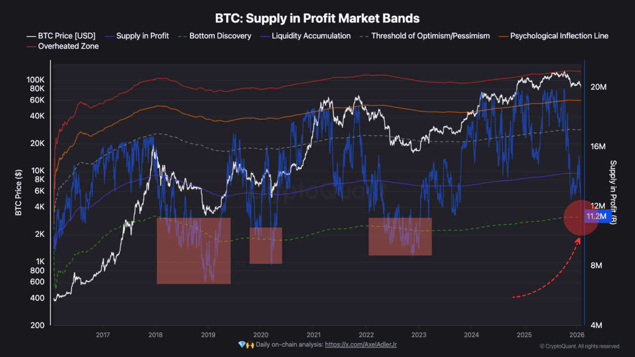 Questo indicatore traccia quanti Bitcoin sono "in profitto" basato sul costo di acquisizione on-chain (analisi UTXO).