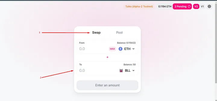 Per scambiare token su Taiko, visita https://swap.a2.taiko.xyz/#/swap?use=v1 e passa alla rete Taiko.