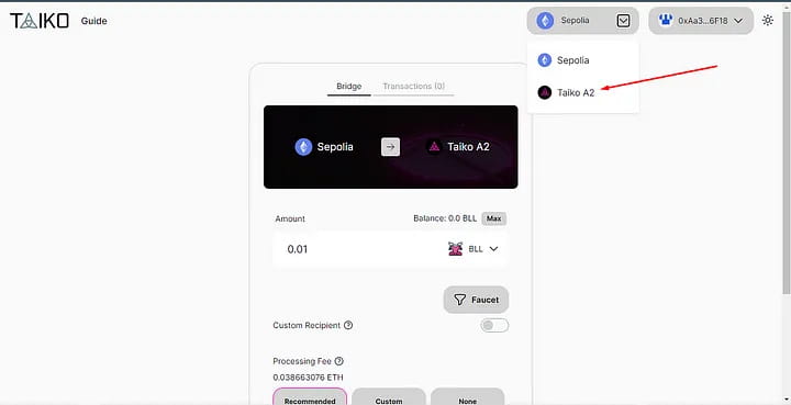 Per ottenere i token di prova: Taiko BLL e Horse, visita https://bridge.a2.taiko.xyz e collega il portafoglio da eth a BLL