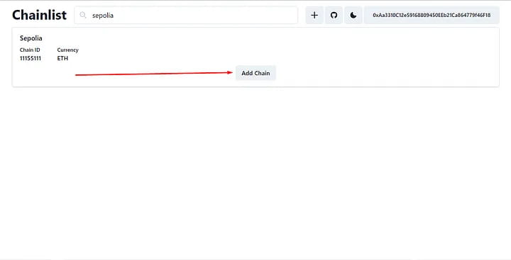 Visita https://chainid.network, connettiti al portafoglio MetaMask e cerca Sepolia