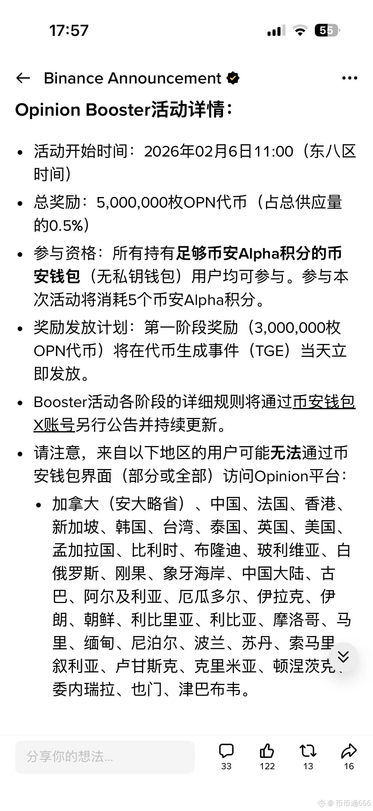 刚才,币安发布了最新booster公告,竟然是热门赛道预测平台项目opinion,这个项目应该会在第一季度TGE,上现货概率也很大。因此可能是个短平快大毛。booster只给了百分之0.5的份额,五百万个币,盘前八个多亿,也就是说空投价值400WU,第一阶段奖励300万个,也有240WU了,所以6号11点活动开始,大概率也是要抢着做的,扣五分做这个任务我认为是很值的,毕竟哪怕十万个名额,人均也有20U了,运气好还能撸个社区空投什么的,更是锦上添花