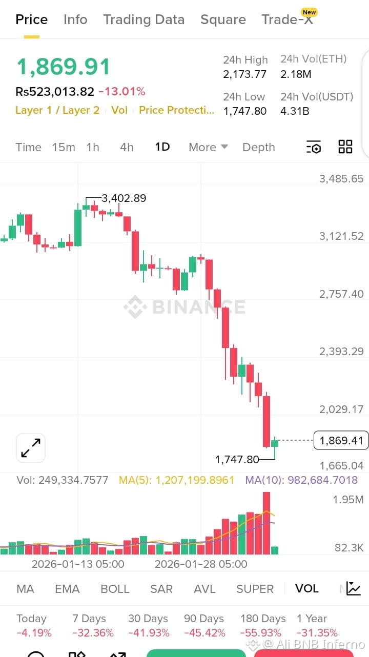 ETH peaked near 3,400 and then entered a persistent downtrend marked by weak bounces and heavy sell pressure. The most important technical failure occurred when Ethereum lost 3,000. That level had acted as psychological and structural support for months. Once it broke sellers accelerated.