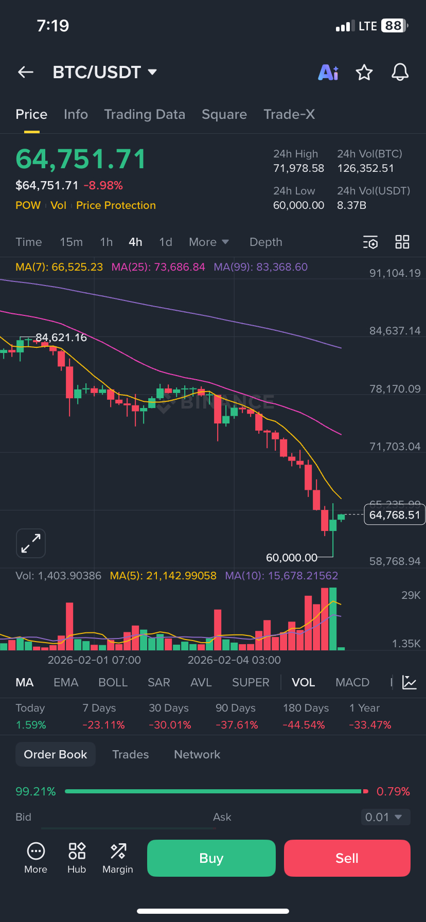 • Forte tendenza al ribasso: il prezzo è al di sotto di MA(7), MA(25) e MA(99) → i ribassisti sono al comando.