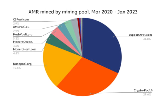 L'analisi a catena ha identificato un campione rappresentativo di destinatari del premio minerario Monero tra marzo 2020 e gennaio 2023. Nel nostro campione, tre principali pool minerari hanno estratto oltre l’80% dell’XMR.
