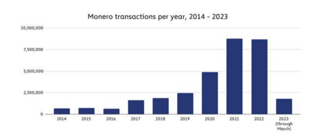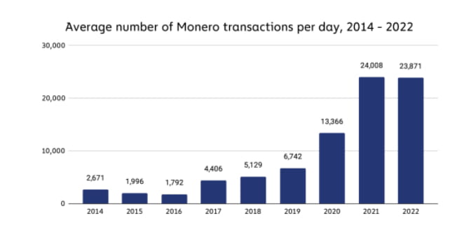 Dalla nascita di Monero nel 2014, ci sono state circa 32 milioni di transazioni XMR. Nel 2022 le transazioni XMR sono state circa 8,6 milioni, in leggero calo rispetto al picco di 8,8 milioni del 2021. In confronto, nello stesso periodo ci sono state quasi 800 milioni di transazioni Bitcoin.