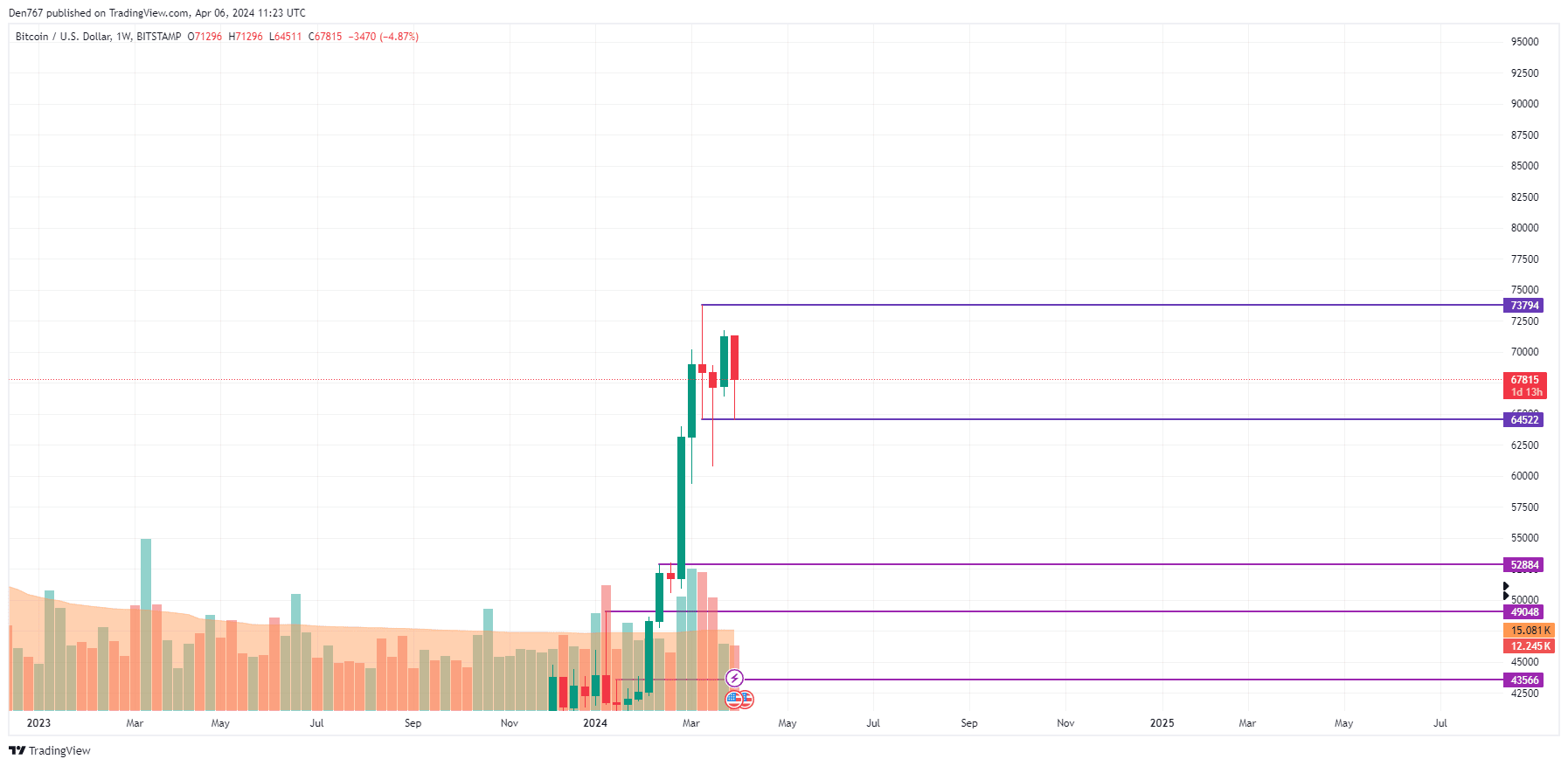 Sul grafico settimanale, il prezzo di BTC è rimbalzato ancora una volta dal livello di supporto di 64.522$. Al momento bisogna prestare attenzione alla chiusura della candela in termini del precedente minimo della barra di 66.407$. Se dovesse verificarsi al di sotto di tale livello, è probabile che il calo continui fino alla zona dei 60.000 dollari.