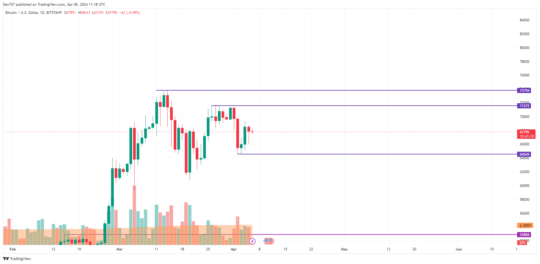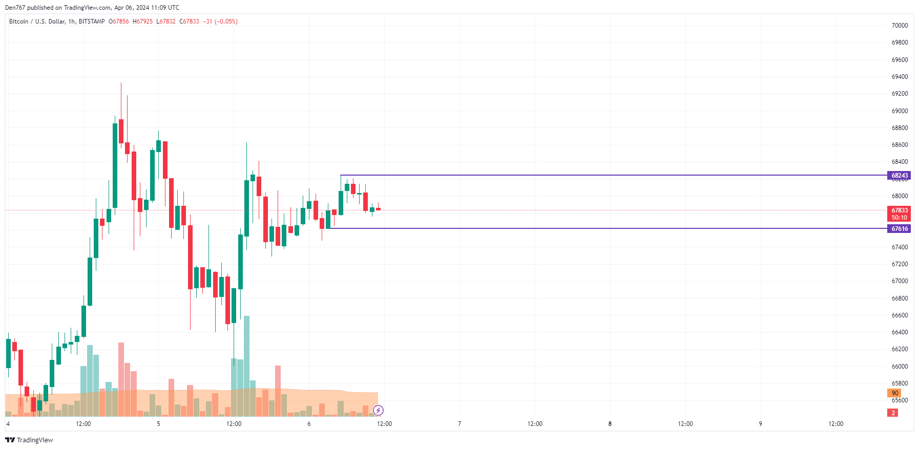 In questo caso, lo scenario più probabile per i prossimi giorni sarebbe un trading laterale in corso nell'area compresa tra 67.000 e 69.000 dollari.