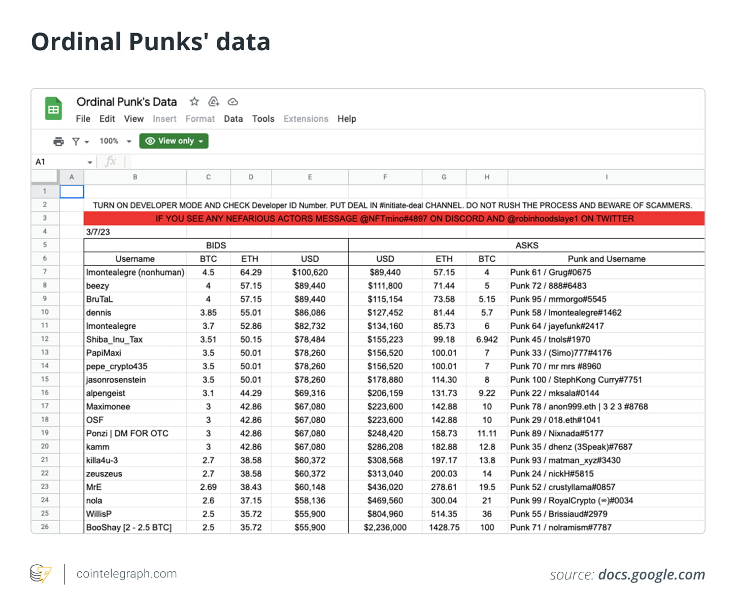 Mentre vengono costruite infrastrutture e mercati adeguati per scambiare Bitcoin Ordinals, gli artefatti digitali vengono scambiati peer-to-peer over-the-counter (OTC) su server Discord dedicati, con depositi in garanzia come intermediari e monitorati sui fogli di Google.