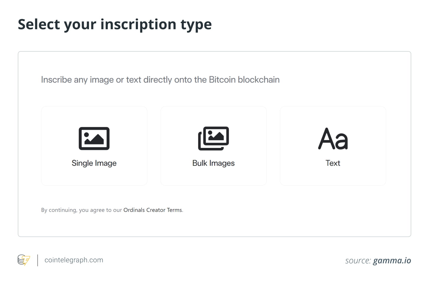 Il secondo metodo è più semplice e prevede l'utilizzo di uno strumento senza codice, come Gamma o Ordinalsbot.com, per iscrivere il tuo NFT ordinale. Ecco come coniare il tuo Ordinale su Gamma: